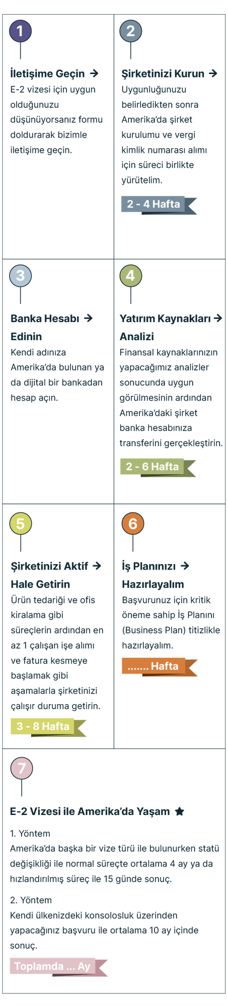 Kendi ülkenizden yapacağınız E-2 vizesi başvurusu ile konsolosluk süreçlerini tamamlayın ve ortalama 10 ay kadar bir süre sonunda başvurunuz sonuçlansın.